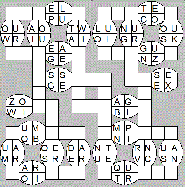 The only clues you have are the letter pairs we've given you in the grid. Each answer consists of a pair of words that share the letters that you'll write in the empty squares. In the example we've given you, we've filled in the letters S, E and W to make SINEW and SCREW. A few of the entries may have more than one possible answer, but only one will fit correctly with the rest of the puzzle.