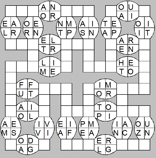 The only clues you have are the letter pairs we've given you in the grid. Each answer consists of a pair of words that share the letters that you'll write in the empty squares. In the example we've given you, we've filled in the letters S, E and W to make SINEW and SCREW. A few of the entries may have more than one possible answer, but only one will fit correctly with the rest of the puzzle.